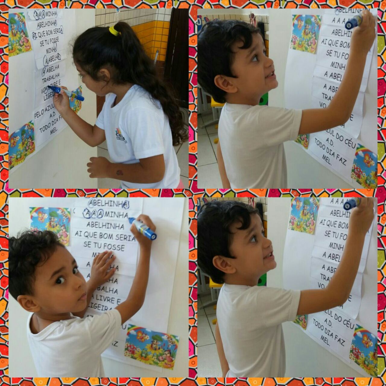 Foi trabalhada a letra "A", através da exposição de alimentos como: abacate, abóbora, abacaxi, ameixa, acerola, amora além de fantoches, caixa surpresa, confecção das colmeias, confecção das abelhinhas com fotos das crianças, máscaras, cartazes, enquetes, painéis, textos informativos sobre abelhas, atividades lúdicas prazerosas e divertidas.